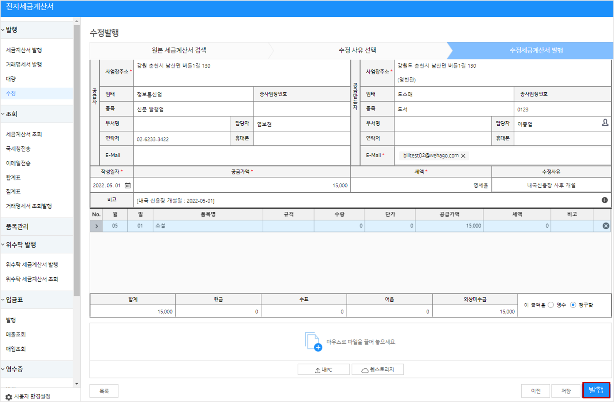 전체 품목이 영세율로 전환 될 경우 품목삭제하지 않고, 전체 금액 마이너스(-)로 기재된 상태로 [다음]버튼을 클릭합니다.