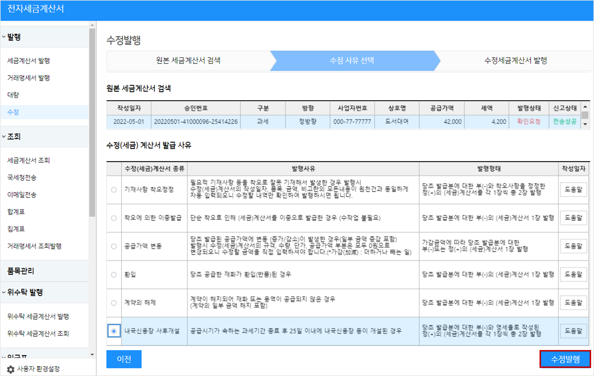 2. 수정세금계산서 사유를 “내국신용장 사후개설” 사유로 체크하시고 하단에 [수정발행] 버튼을 누릅니다.