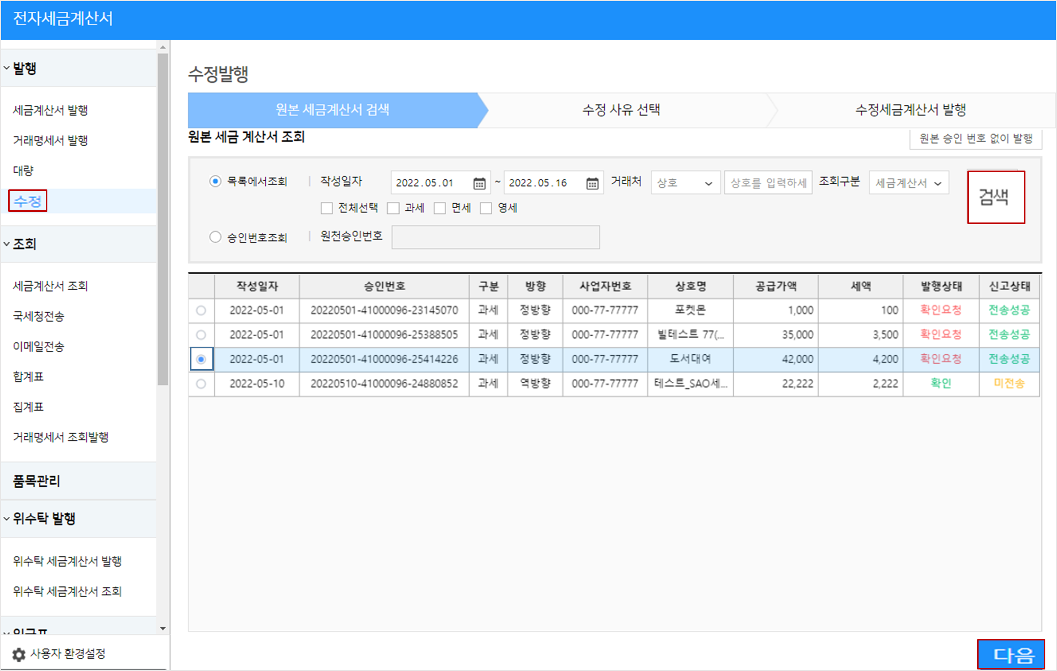 수정발행 할 세금계산서를 검색하여 선택하시고 [다음]버튼을 클릭합니다.