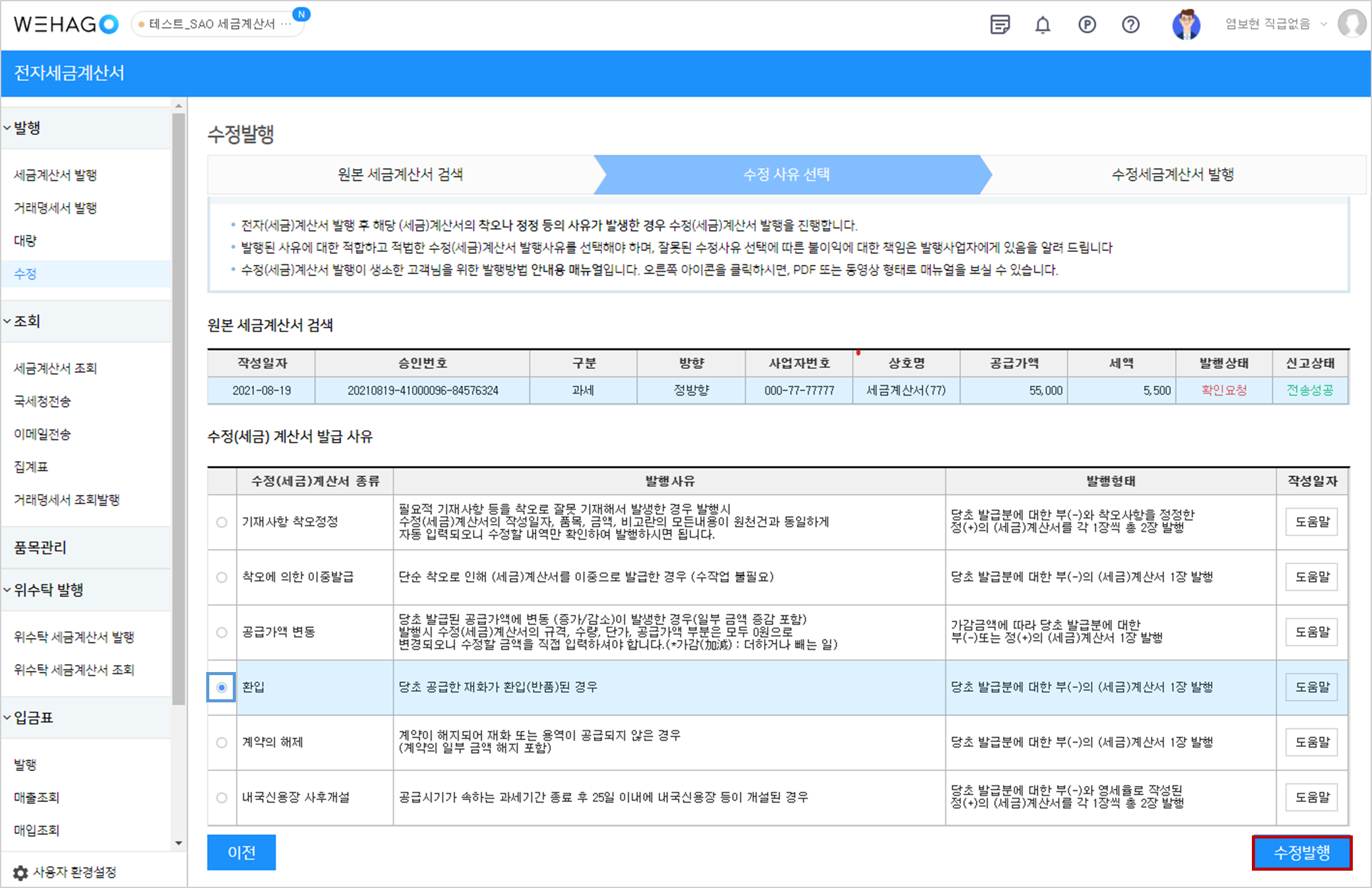 2. 수정(세금)계산서 발급 사유를 "환입" 사유로 체크하시고 하단에 [수정발행] 버튼을 누릅니다.