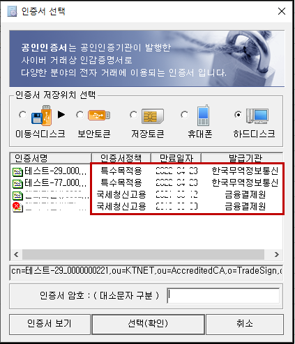 ※WEHAGO 서비스에서는 사용불가한 용도의 인증서는 조회되지 않습니다.