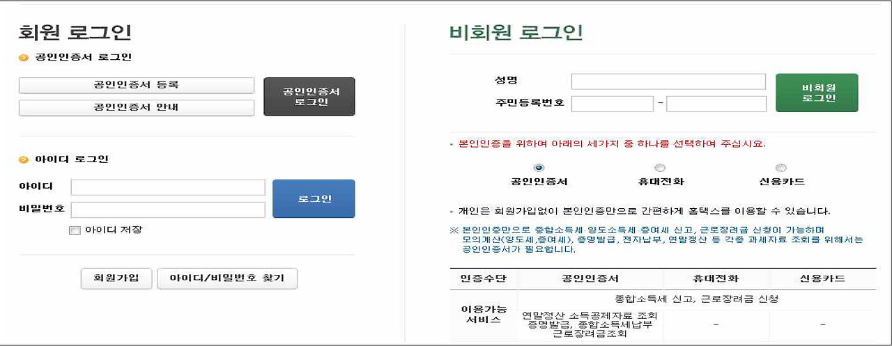- 로그인: 공동인증서 (공인인증서) 또는 간편인증 등을 통해 본인인증