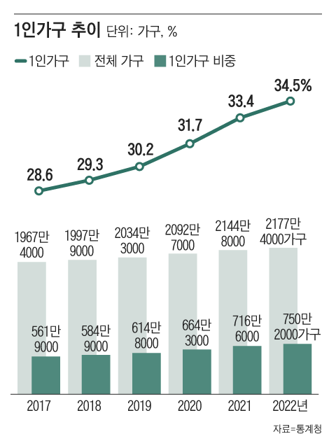 - 1인 가구의 급증: 과거에는 확대가족 형태가 많았으나, 최근에는 1인 가구 비중이 크게 늘었습니다. 예컨대 1975년 약 4.2%였던 1인 가구 비율이 2020년에는 약 31.7% 수준까지 증가했습니다.