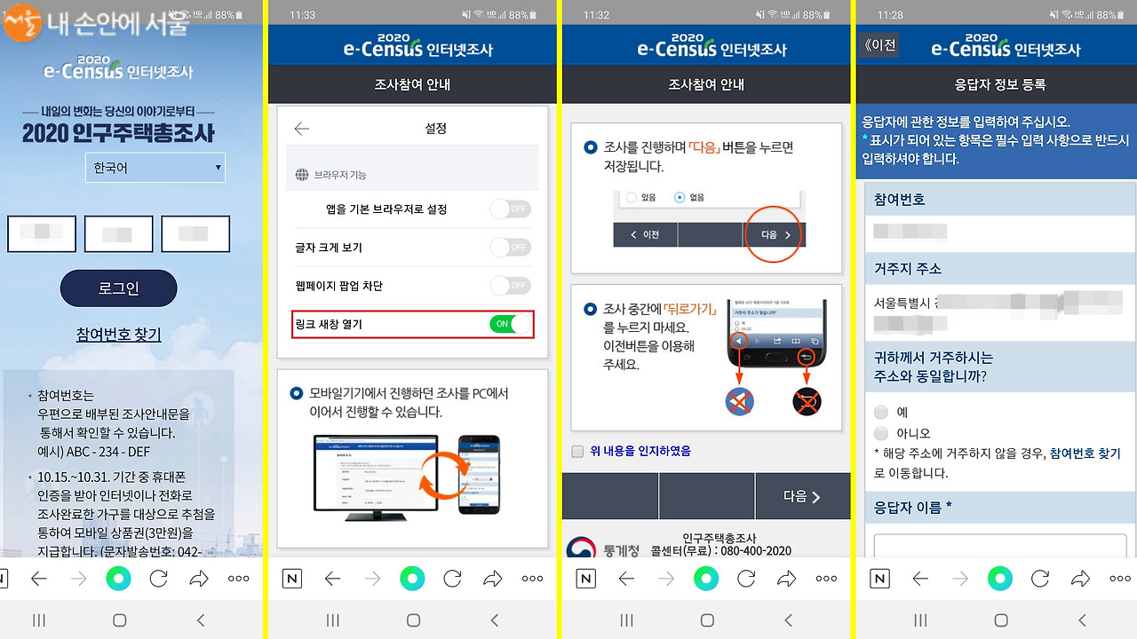 - 일반 가구는 인터넷 또는 전화조사를 우선적으로 안내받게 되며, 응답이 이뤄지지 않을 경우 조사원이 직접 방문하는 방식이 병행됩니다.