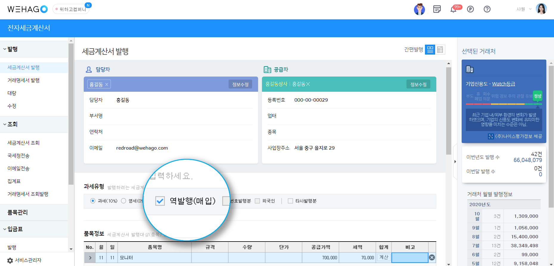 ① 과세유형 '역발행(매입)' 에 체크 하여 세금계산서를 작성합니다.